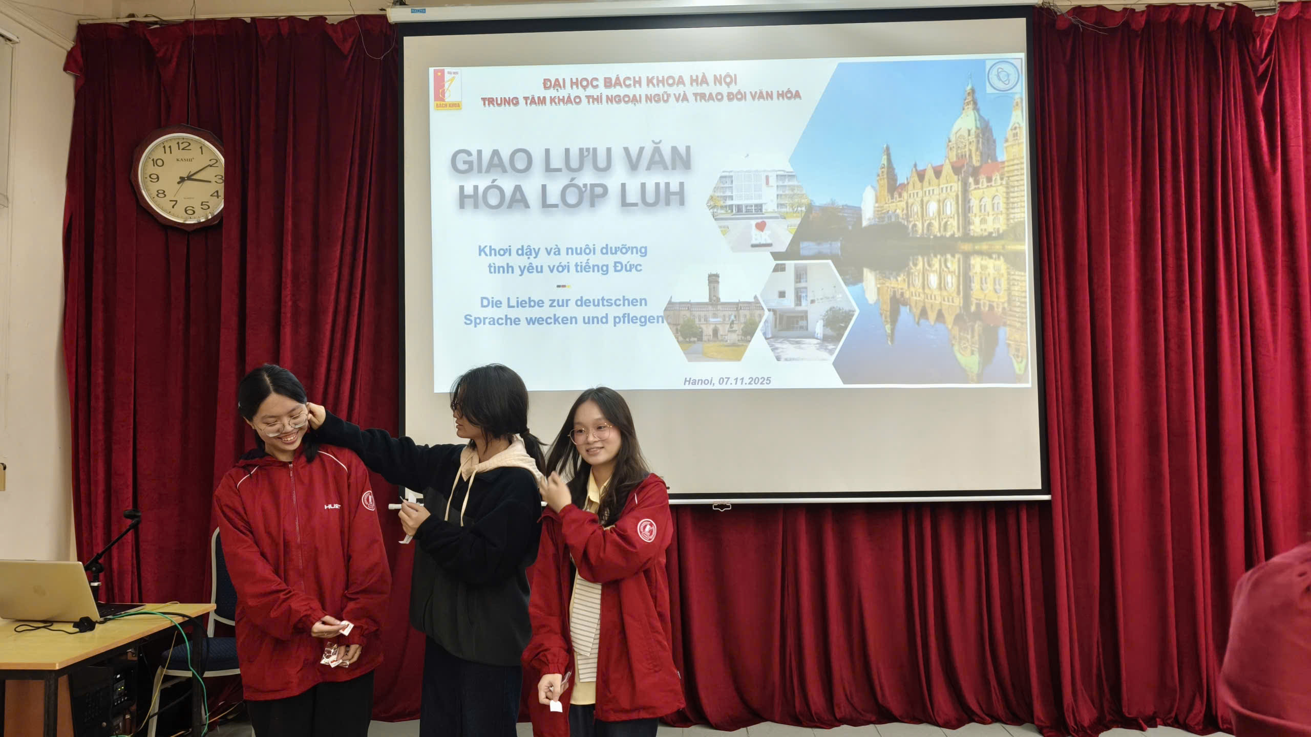 Thứ Sáu, ngày 07.11.2025, tại Trung tâm Khảo thí Ngoại ngữ & Trao đổi Văn hóa – Đại học Bách khoa Hà Nội, không khí tràn ngập niềm vui, sự hứng khởi và cảm xúc đặc biệt trong buổi Giao lưu Văn hóa của lớp tiếng Đức LUH (Leibniz Universität Hannover). Với chủ đề “Khơi dậy và nuôi dưỡng tình yêu với tiếng Đức – Die Liebe zur deutschen Sprache wecken und pflegen”, chương trình đã thực sự trở thành cầu nối giữa các giảng viên Việt Nam – Đức và sinh viên Bách Khoa, cùng lan tỏa niềm đam mê học hỏi, khám phá và giao lưu văn hóa.