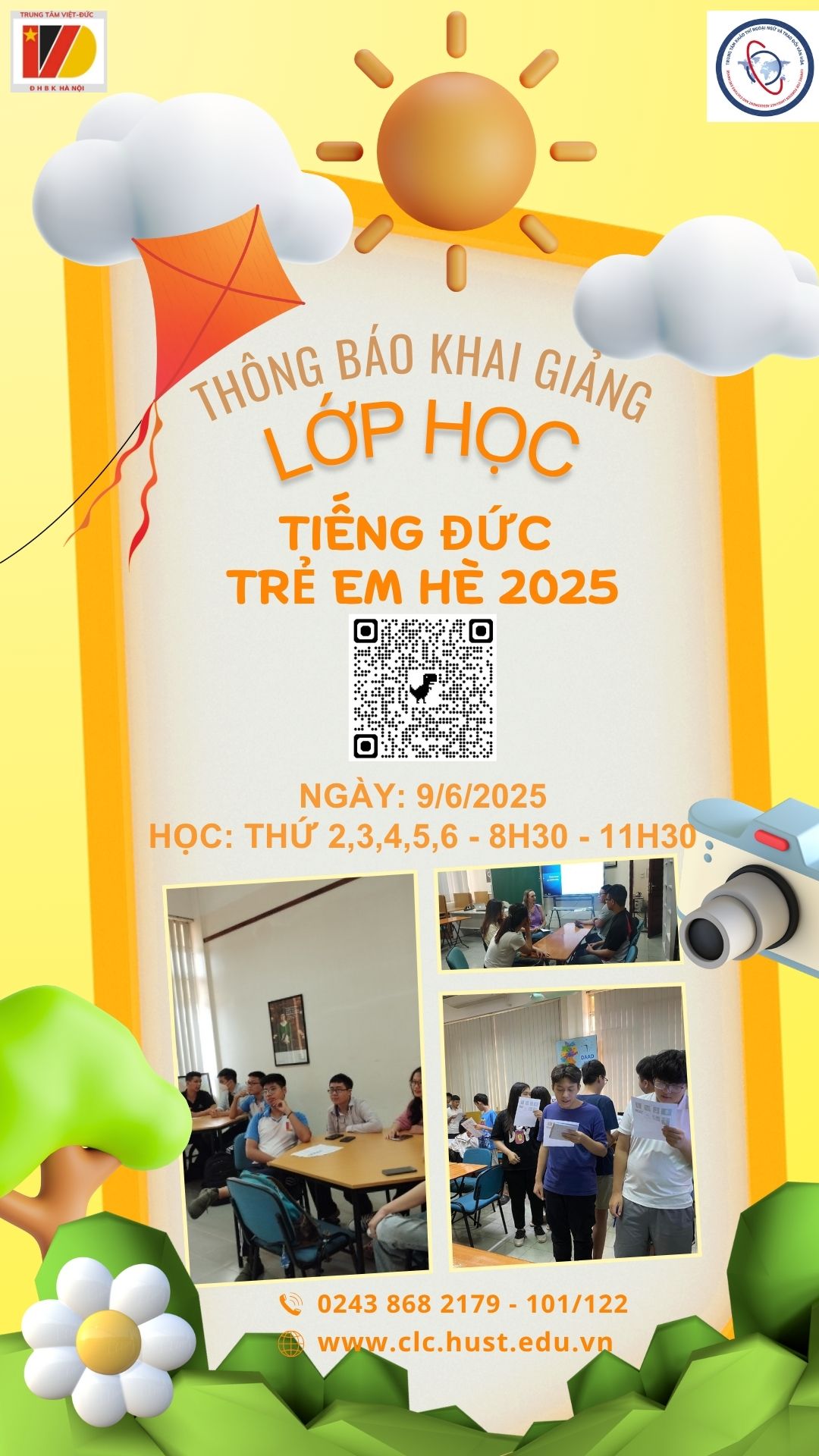 Trung tâm Khảo thí ngoại ngữ và Trao đổi văn hóa (CLC) – ĐH Bách khoa Hà Nội xin thông báo lịch khai giảng lớp Tiếng Đức trẻ em hè 2025 (mã lớp: A11 2505) như sau: