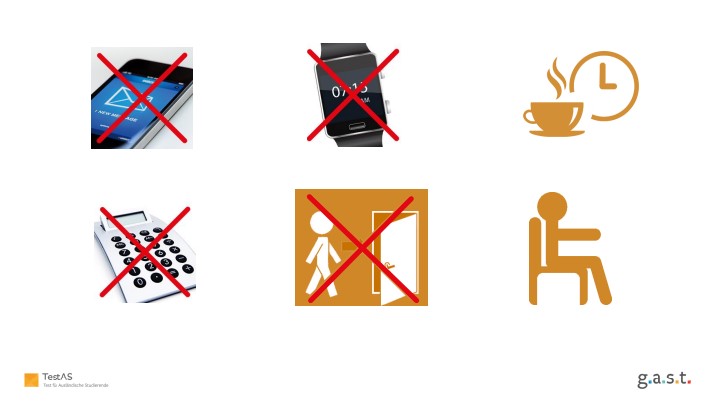 - Điện thoại di động và máy nhắn tin, cũng như bất kỳ thiết bị điện tử nào khác khi gửi ở phòng gửi đồ phải được tắt nguồn trong suốt thời gian thi. Nếu điện thoại di động của bạn đổ chuông trong khi thi, bạn sẽ bị loại khỏi kỳ thi. Nếu cố tình dùng điện thoại trong giờ thi hoặc trong giờ giải lao bạn cũng bị loại khỏi kỳ thi. Bạn chỉ được phép lấy thức ăn, đồ uống và đồ vệ sinh cá nhân ra khỏi túi trong thời gian nghỉ giải lao. Không được gọi điện thoại hoặc tra cứu tài liệu, sách vở trong giờ giải lao. Trong kỳ thi, chỉ được phép mang hộ chiếu hoặc CCCD, giấy báo dự thi và bút bi, bút đánh dấu hoặc tương tự, cũng như một lượng đồ uống thích hợp và đồ ăn để trên bàn của bạn.