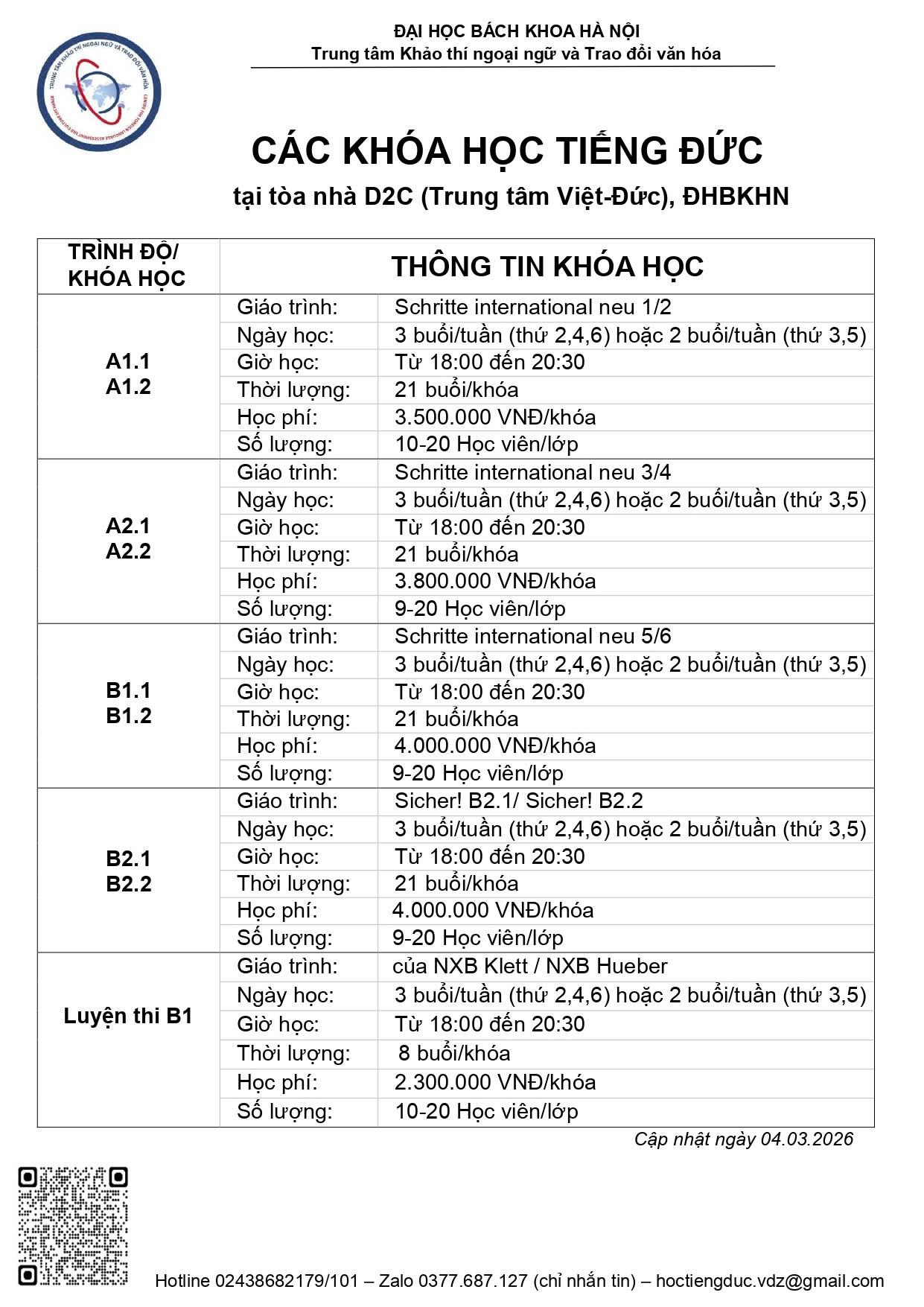 Nhằm đáp ứng nhu cầu học tập ngày càng tăng của học viên, các khóa học tiếng Đức tại Trung tâm Việt–Đức, Đại học Bách Khoa Hà Nội được tổ chức khai giảng liên tục trong năm, với đa dạng cấp độ từ A1, A2, B1, B2 đến các khóa luyện thi chứng chỉ quốc tế.